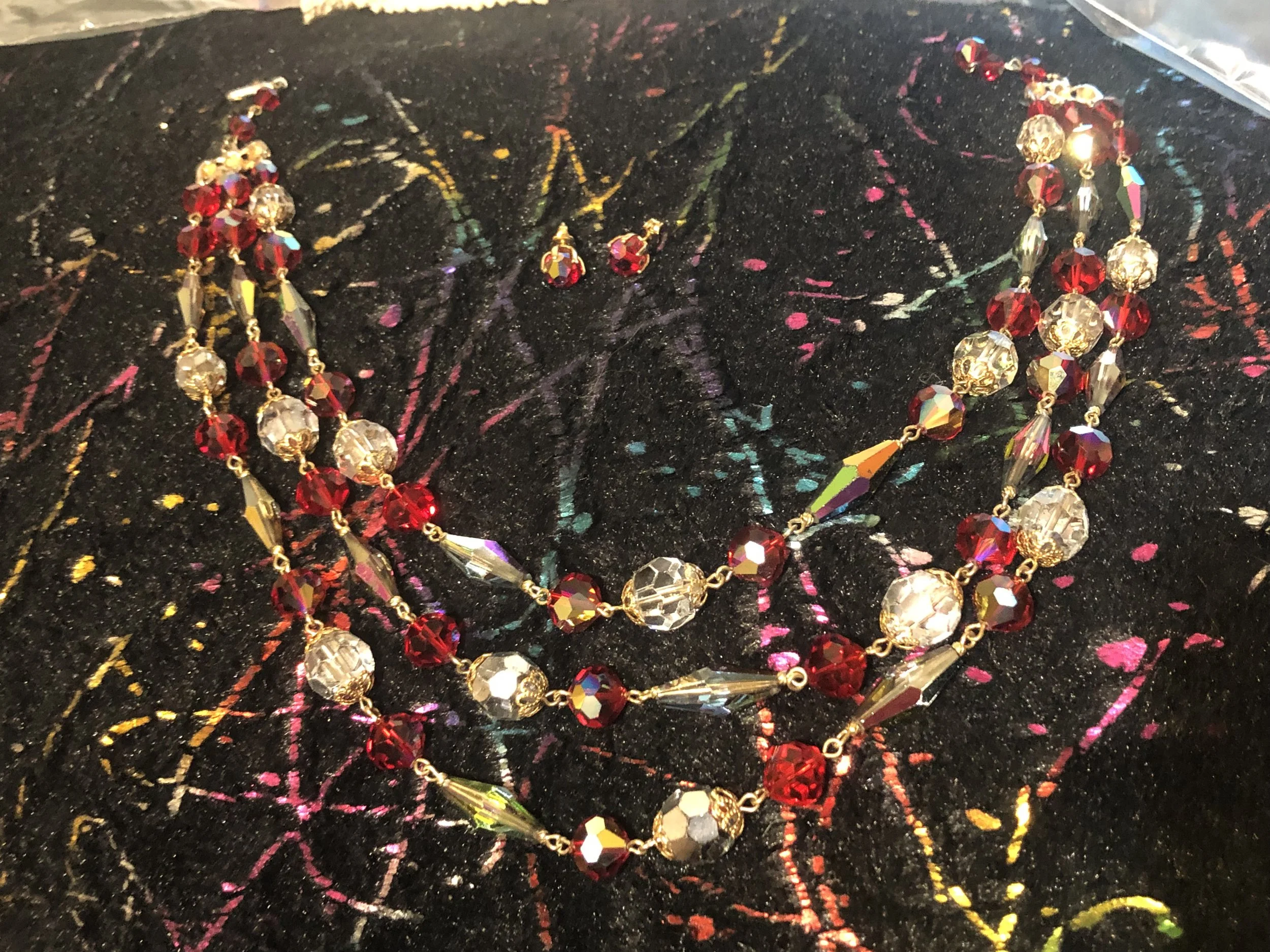 This is a beautiful set consisting of a three-strand crystal necklace with red, clear, and gray iridescent crystals on gold tone metal with gold tone bead caps. Includes a pair of matching pierced single red iridescent earrings. In excellent condition.