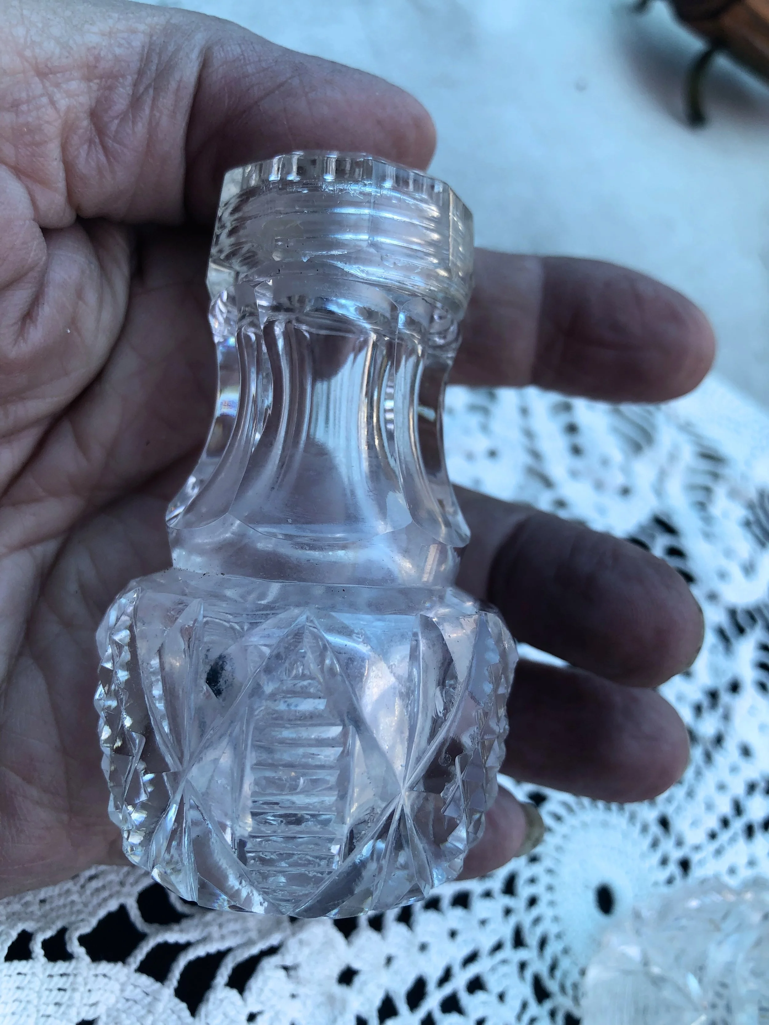 Design includes diamonds, lines, and ribs. They also have glass tops. In really good shape but do have tiny knicks in bottom corners. (6-17-23 A)